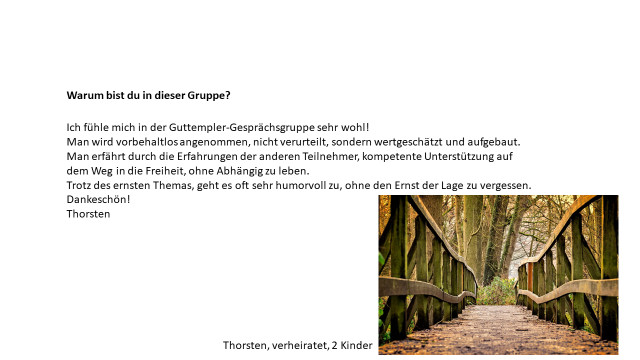 Wir treffen uns, um von einander zu lernen und jeder darf für sich einen Weg in die dauerhafte Abstinenz finden.